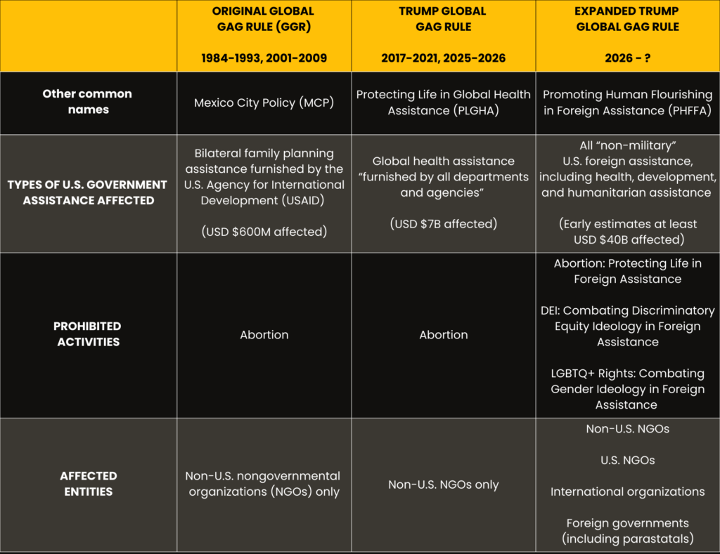 The Trump administration’s decision to dramatically expand the Global Gag Rule will be implemented as previous iterations have been, through standard provision language that is attached to new grant or cooperative agreements. The language could be added to bilateral health agreements, impacting other nations for the first time. For entities that choose to comply, they will be blocked from providing information, referrals, or services for legal abortion or to advocate for access to abortion services in their own countries or for advancing DEI and LGBTQI+ rights. Organizations that refuse to comply with this policy will lose U.S. funding. The already devastating cuts to U.S. foreign assistance will be compounded by this policy, preventing health professionals from delivering essential health services, threatening individuals’ bodily autonomy, and harming women and girls around the world.